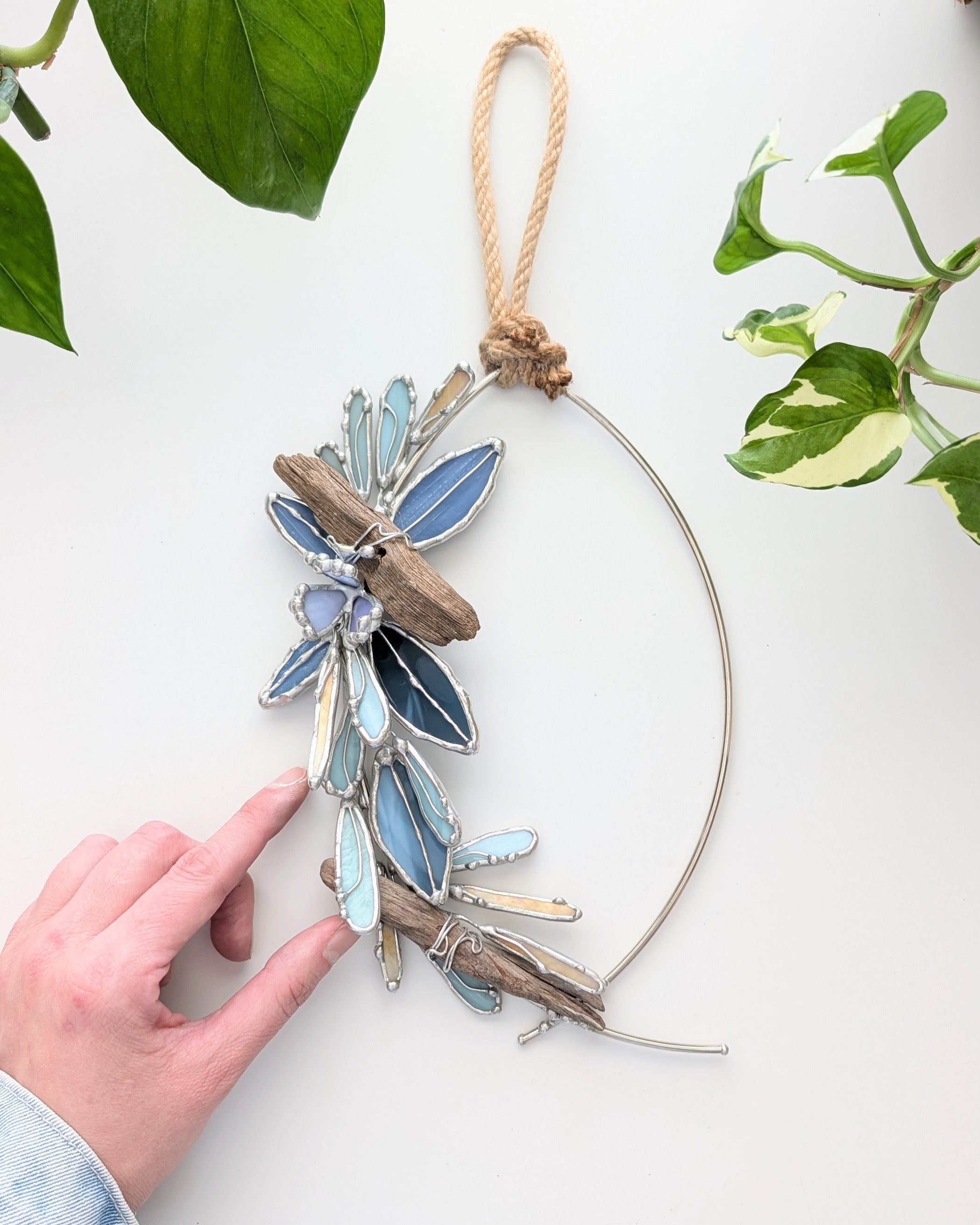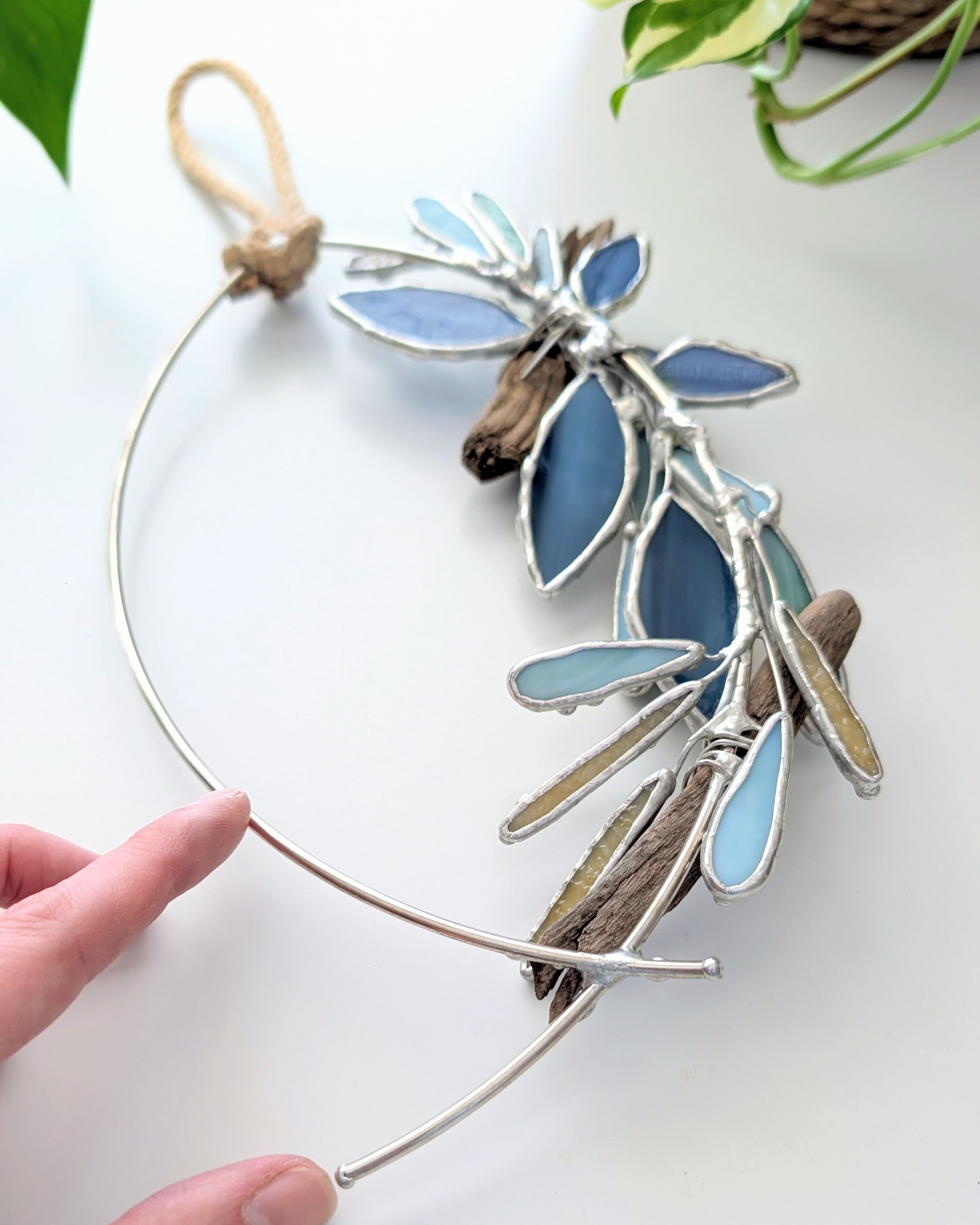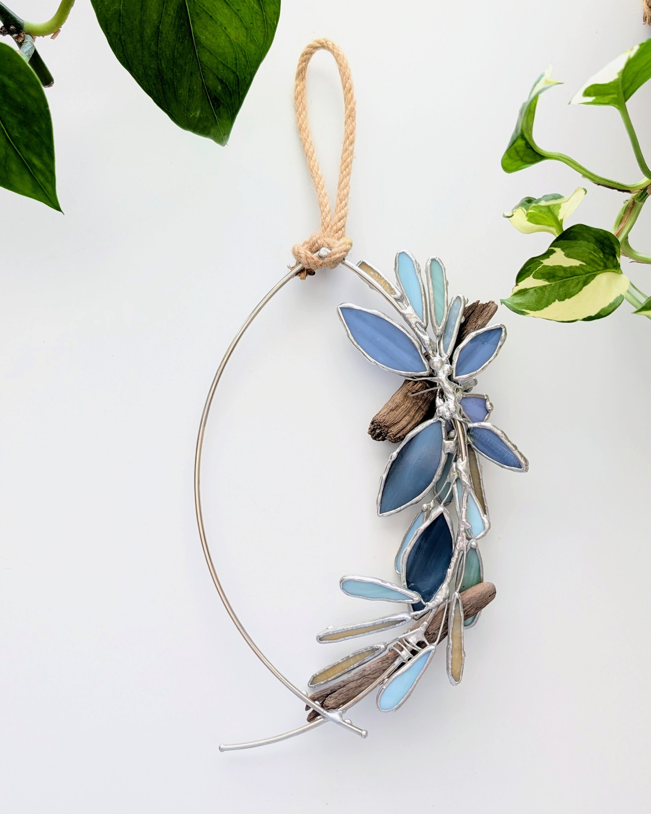 Harvest is a 10" botanical stained glass halo featuring layered blue, pale aqua, and cream glass leaves with hand-selected driftwood on a circular metal frame. Light, airy, and full of movement, the composition has an abundant feel - like joy overflowing, hence the name "harvest."