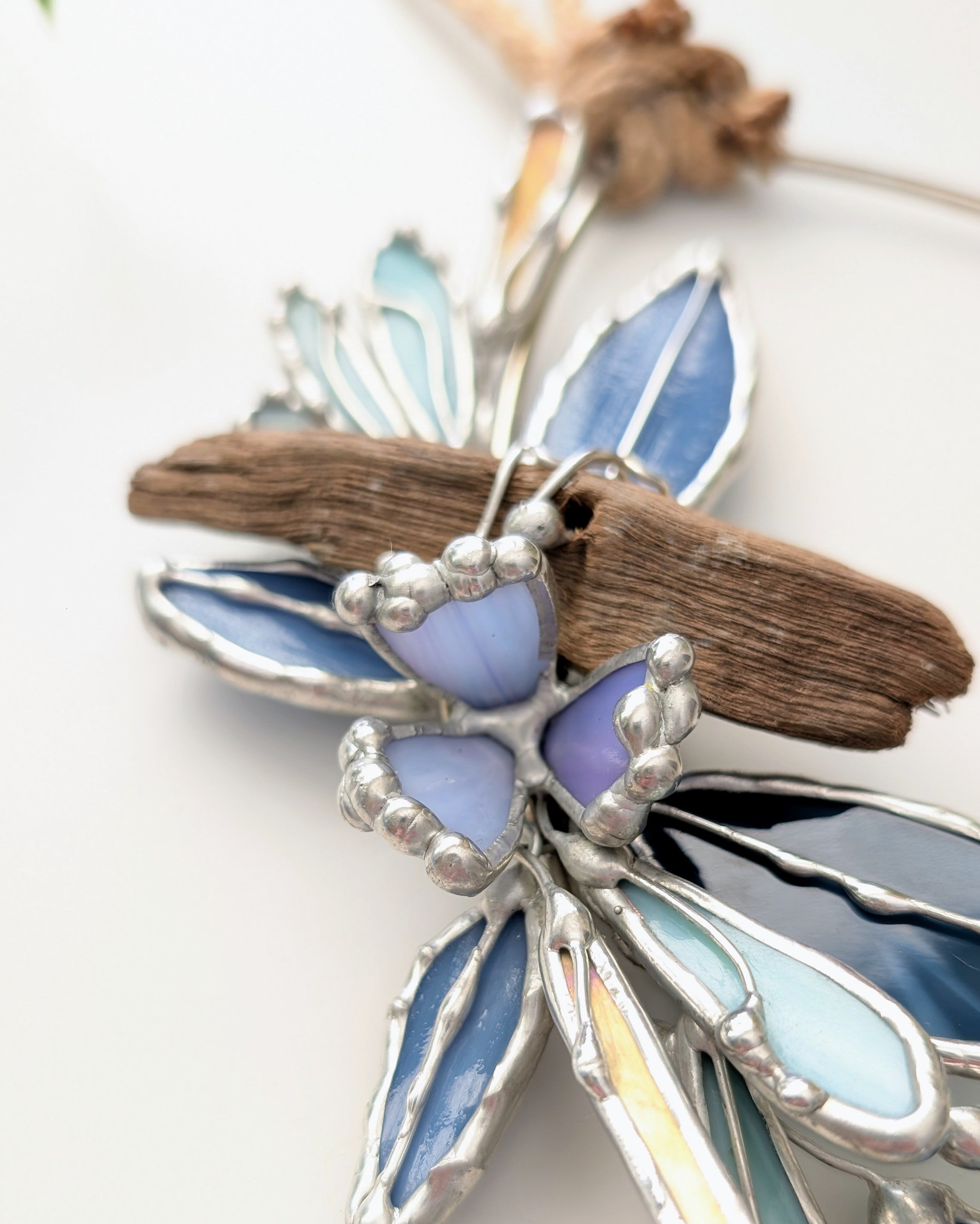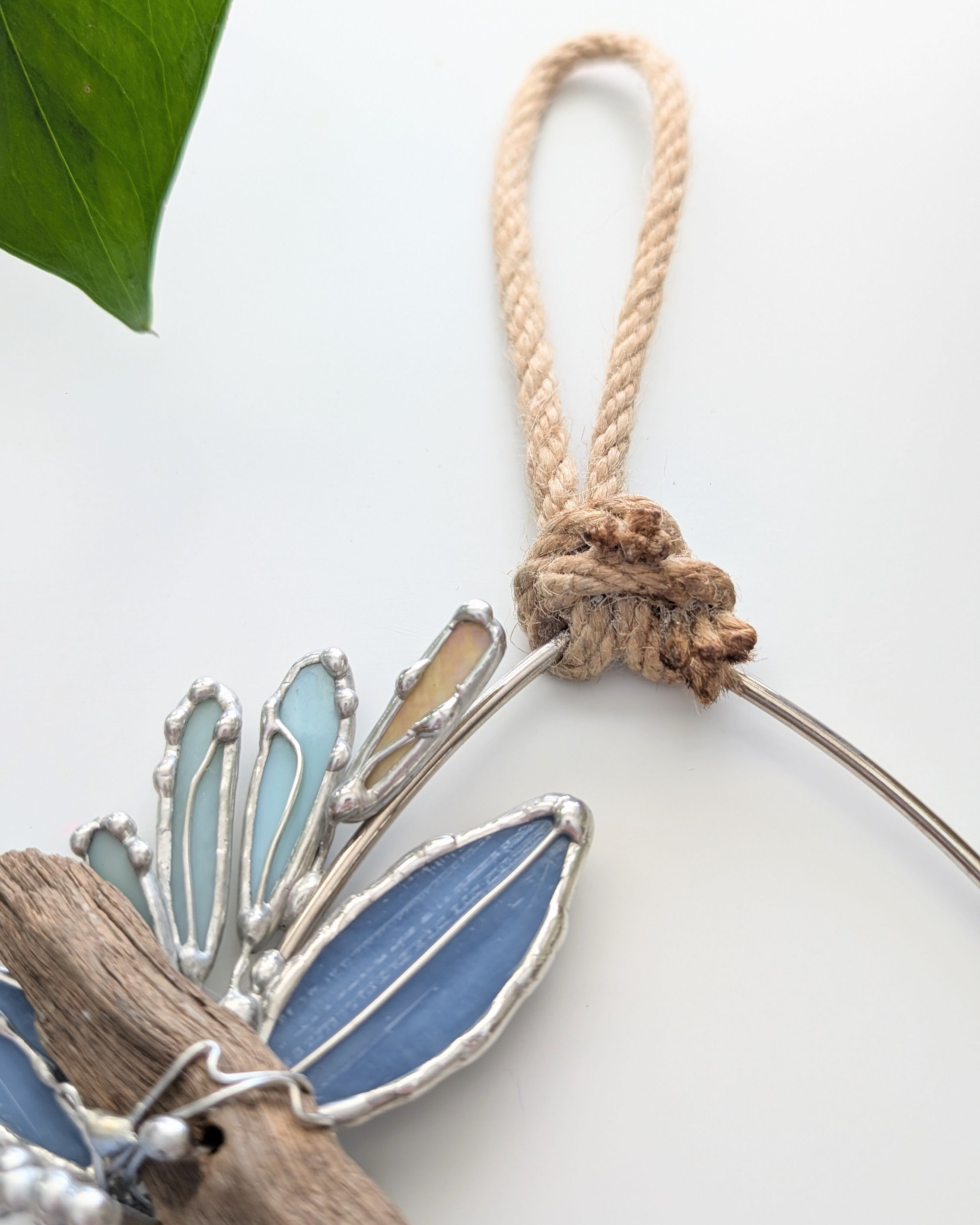 - Stained glass, kiln-formed glass gem, wire, driftwood, jute rope, metal frame