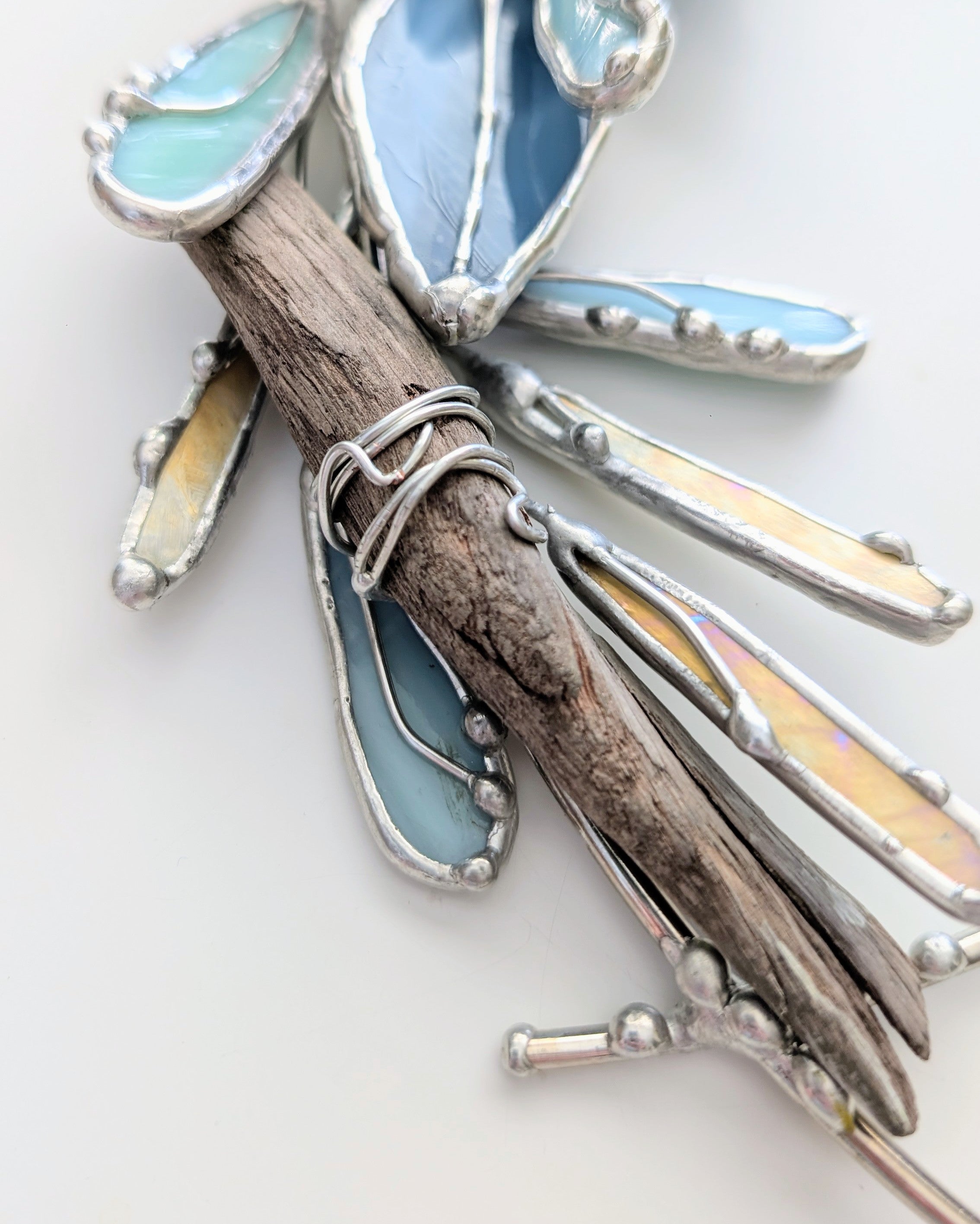 Each glass element is individually cut, shaped, foiled, and soldered by hand, then arranged to follow the curve of the halo. The layered leaves catch the light beautifully, while the driftwood adds warmth, texture, and contrast.