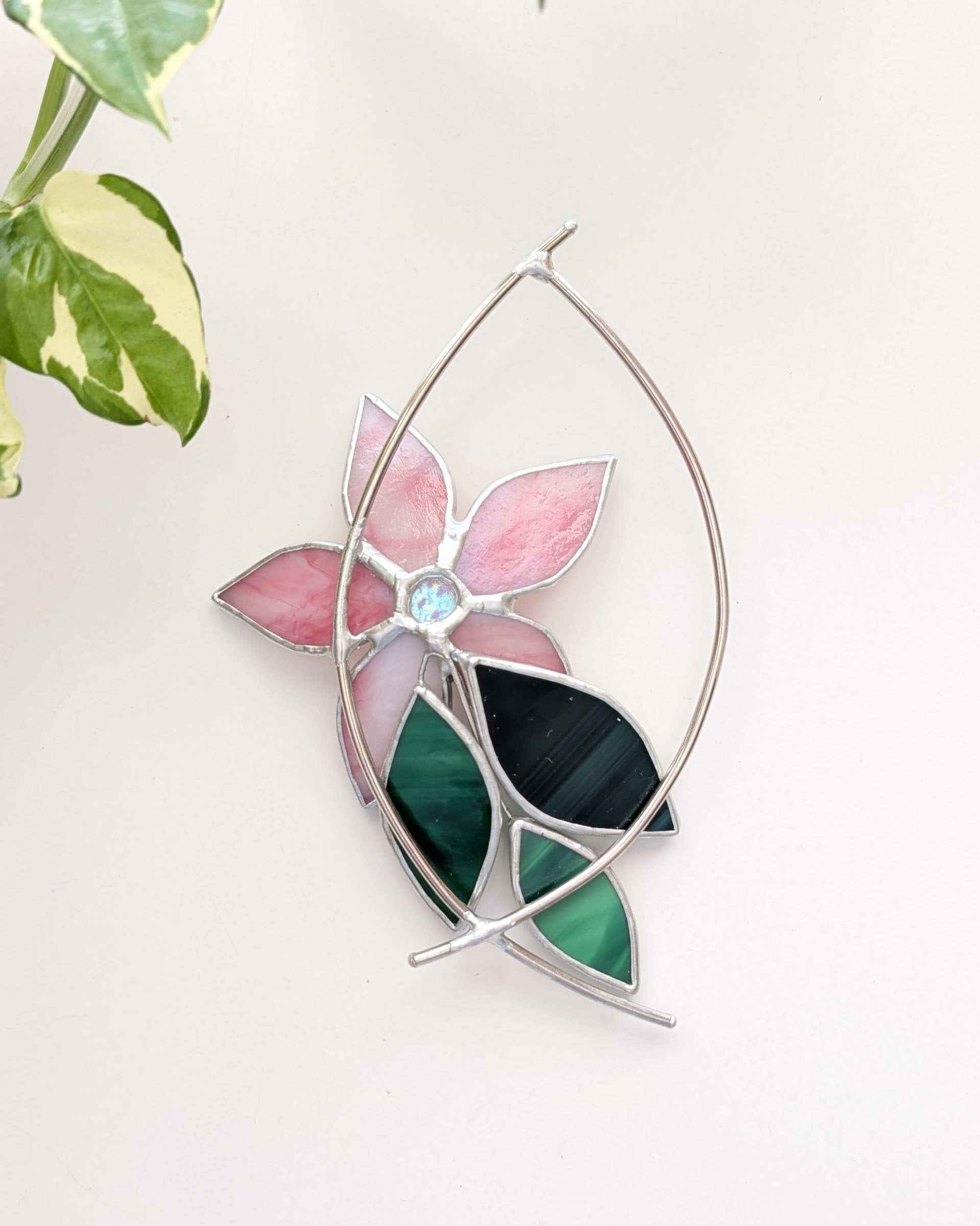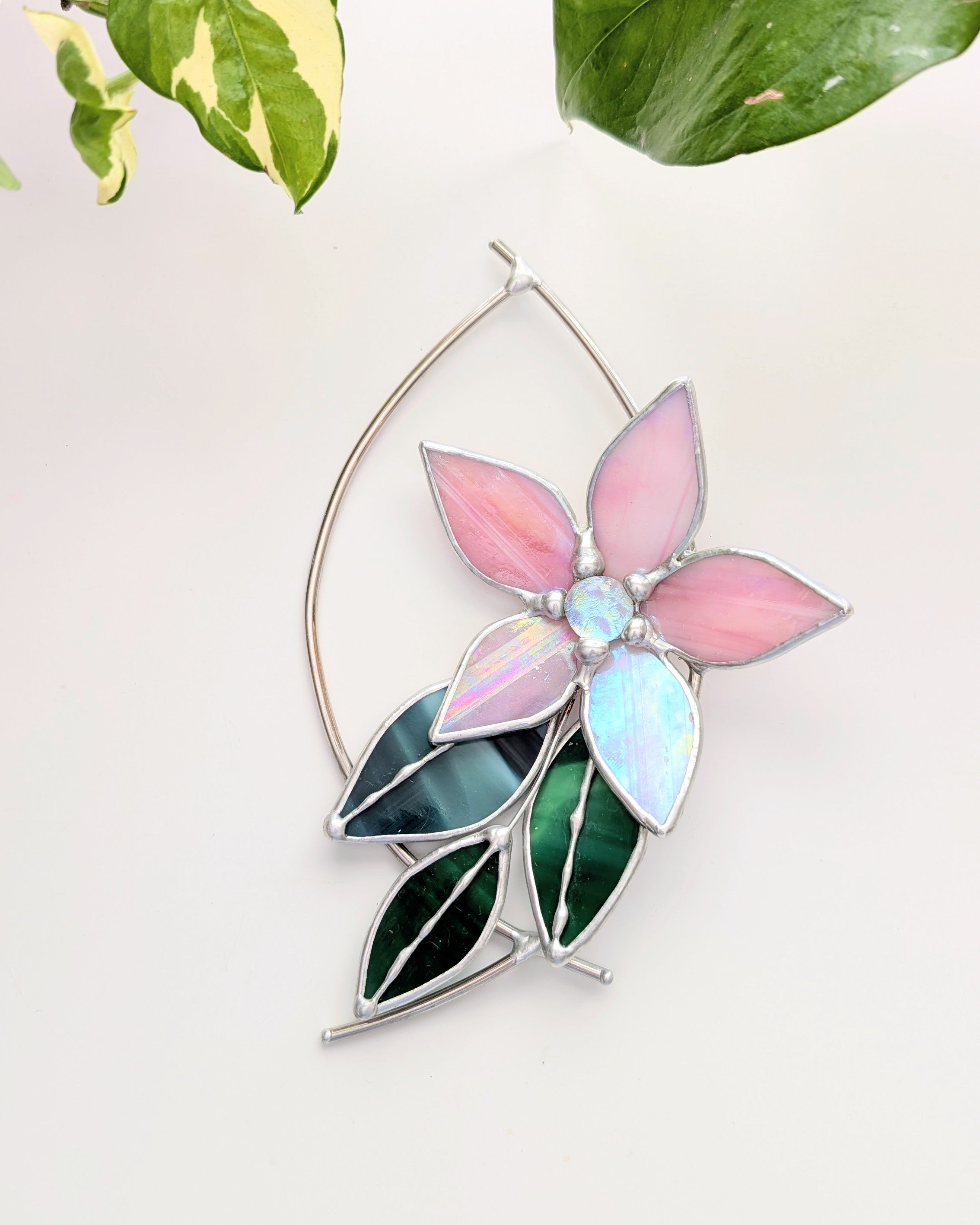 Lala is a 7" stained glass botanical drop with soft pink petals, layered green leaves, and a teardrop frame. The flower has a pretty mix of blush pink and luminescent glass that shimmers and catches the light beautifully.