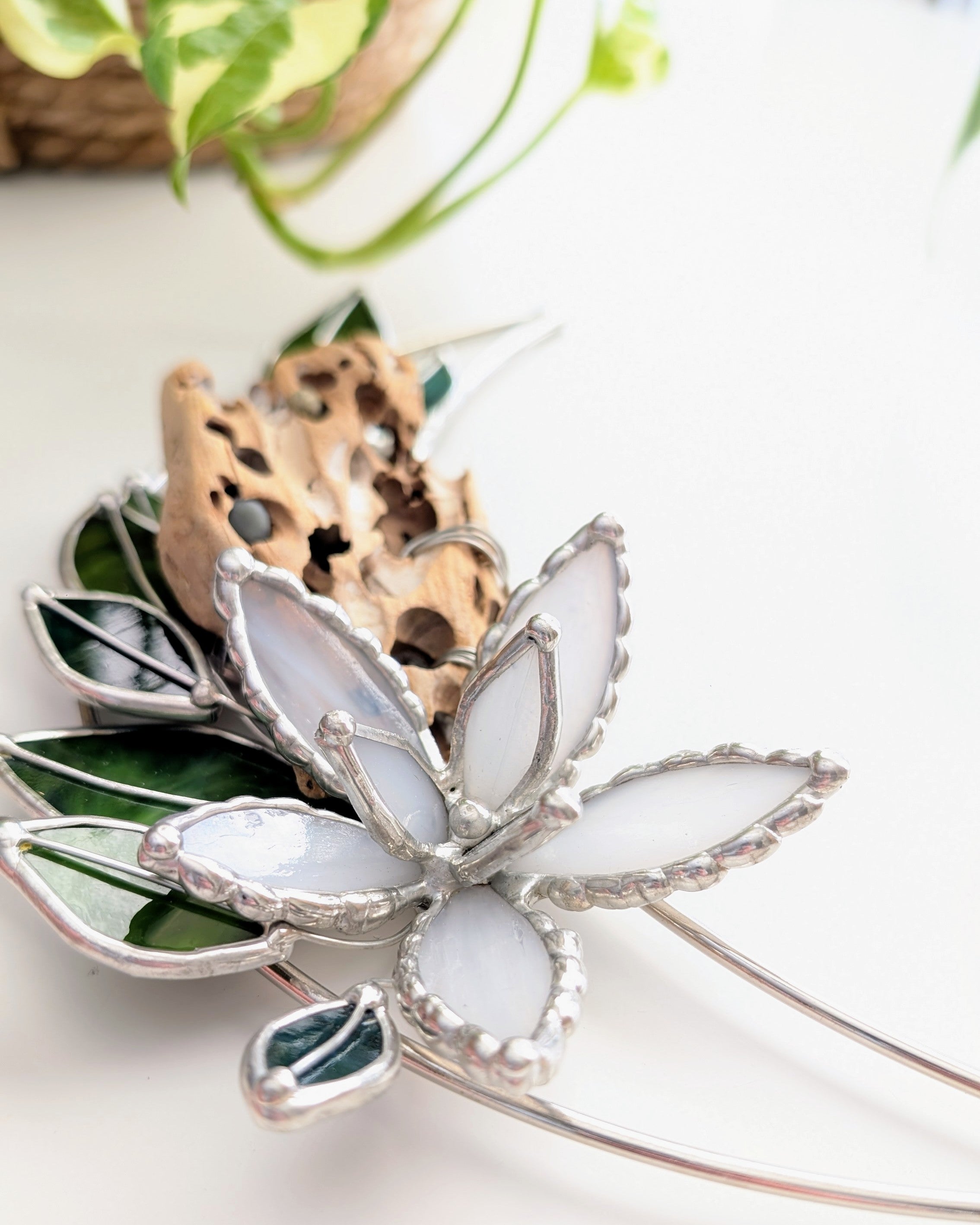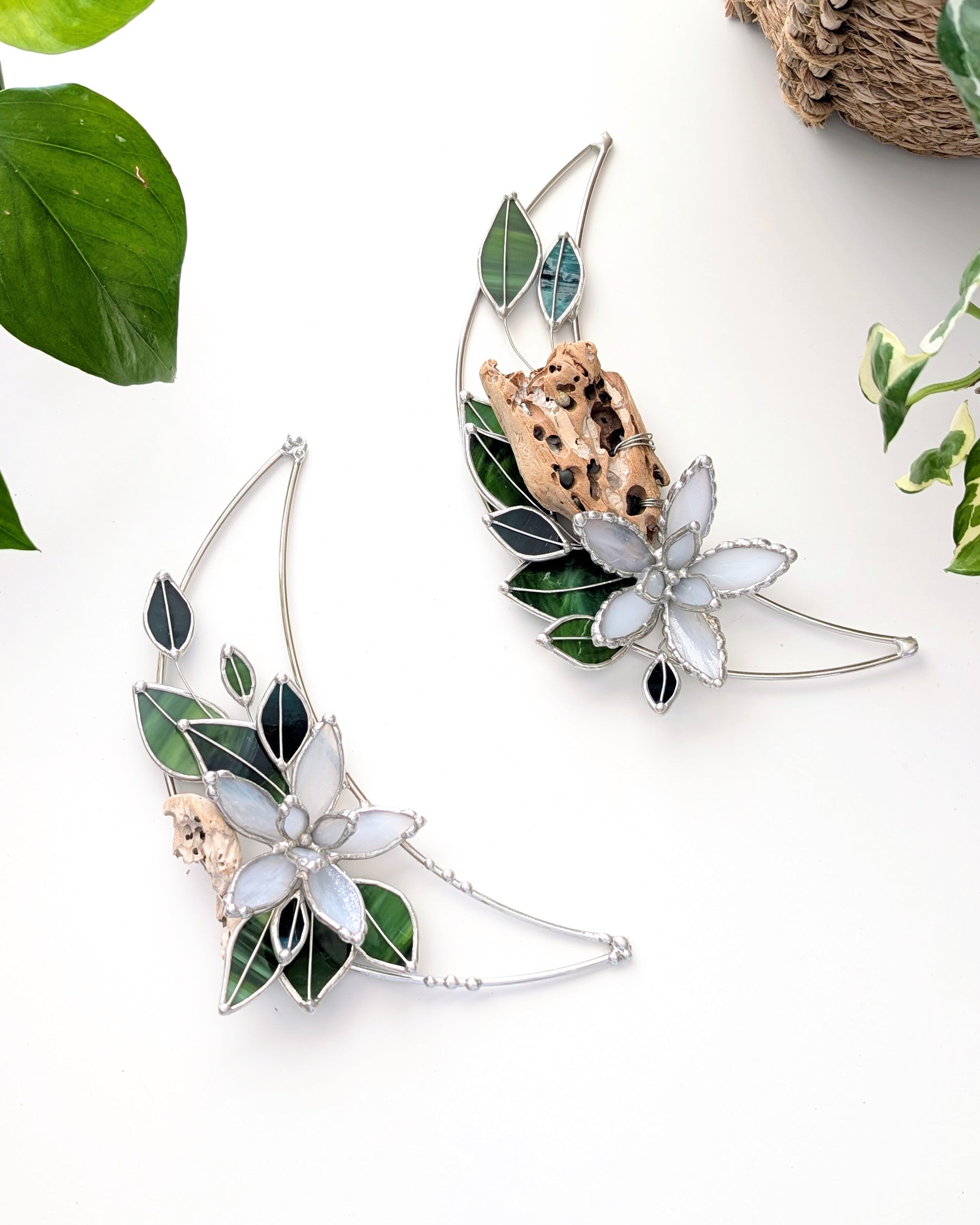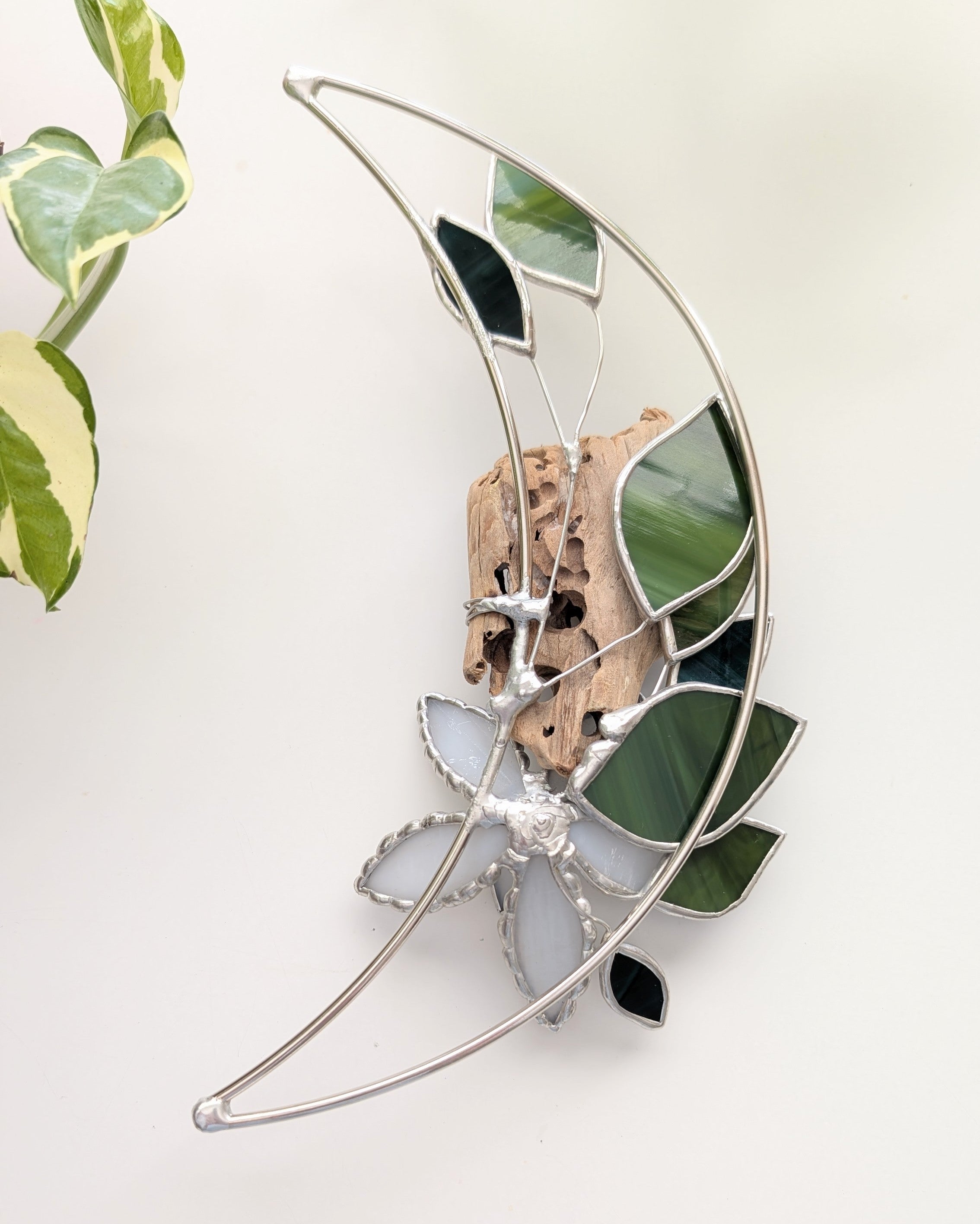 Sable is a 9" tall stained glass botanical moon with deep green glass leaves, soft white floral details, and hand-selected driftwood on a crescent frame. A little moodier and more grounded than Lumi, this piece has a wild, woodsy feel with lots of texture and character.