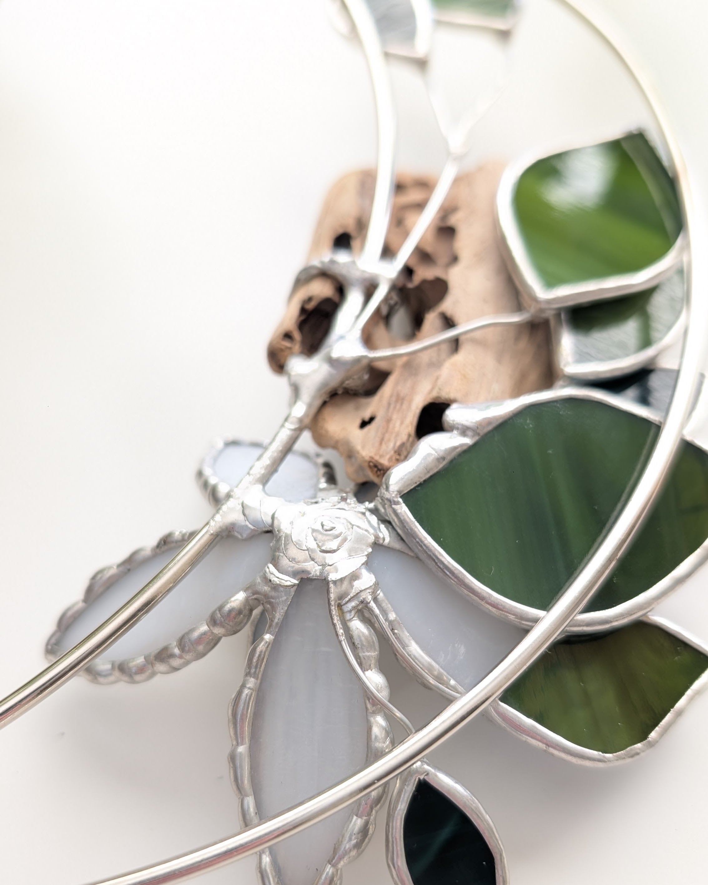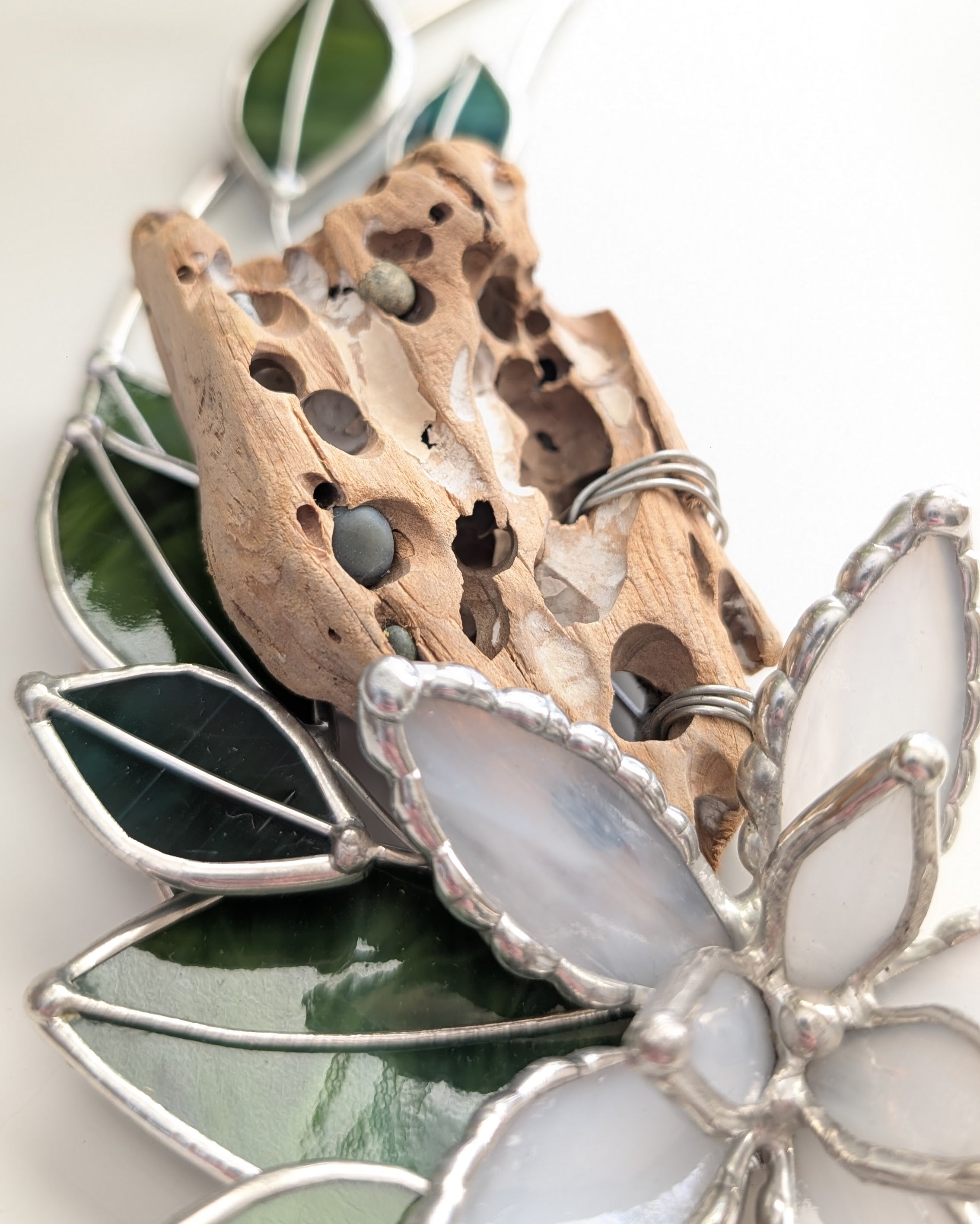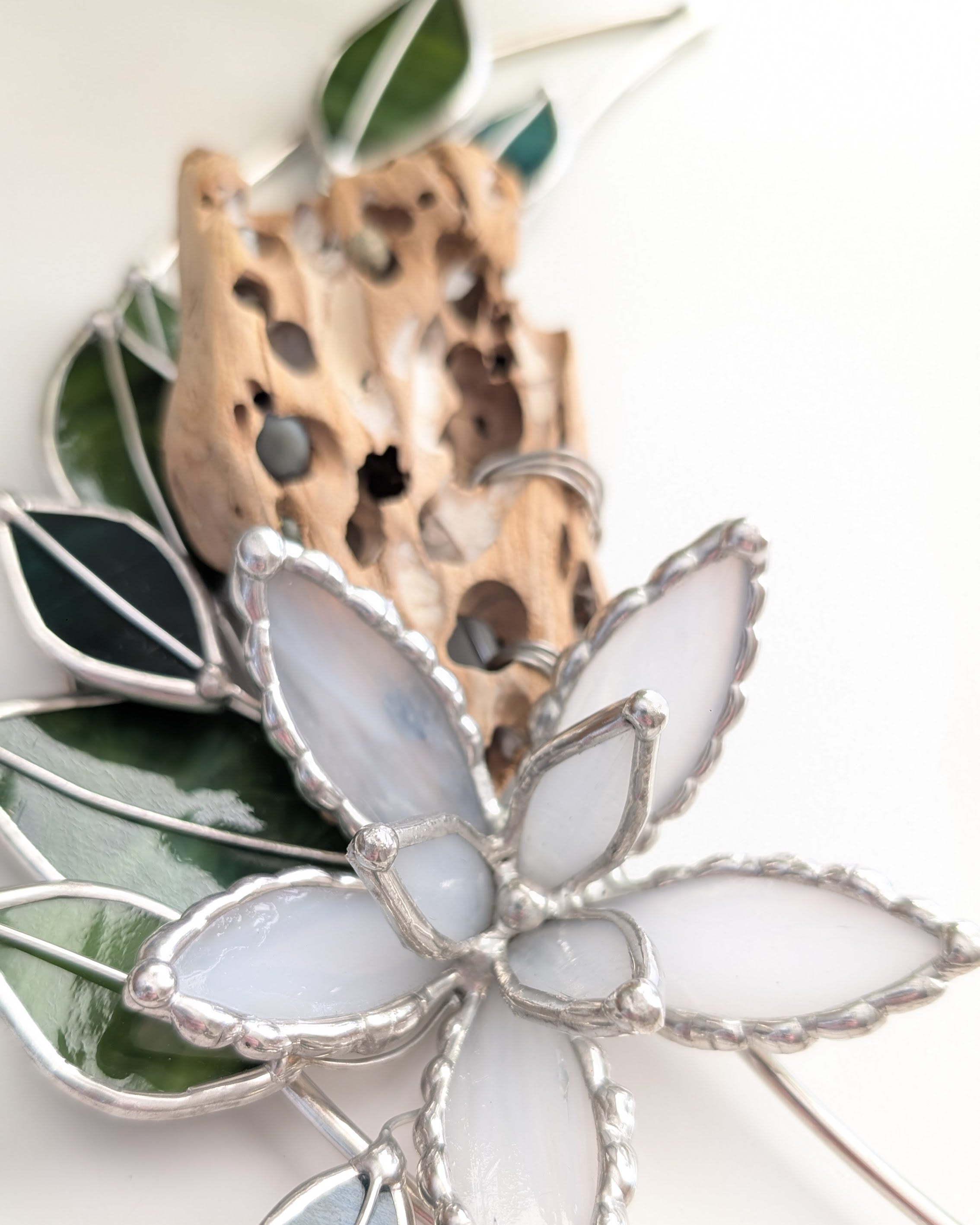 Each glass element is individually cut, shaped, foiled, and soldered by hand, then arranged around the driftwood and frame to create movement, layers, and detail. The soft white flower pops against the darker green glass, while the driftwood brings warmth and a raw natural edge.