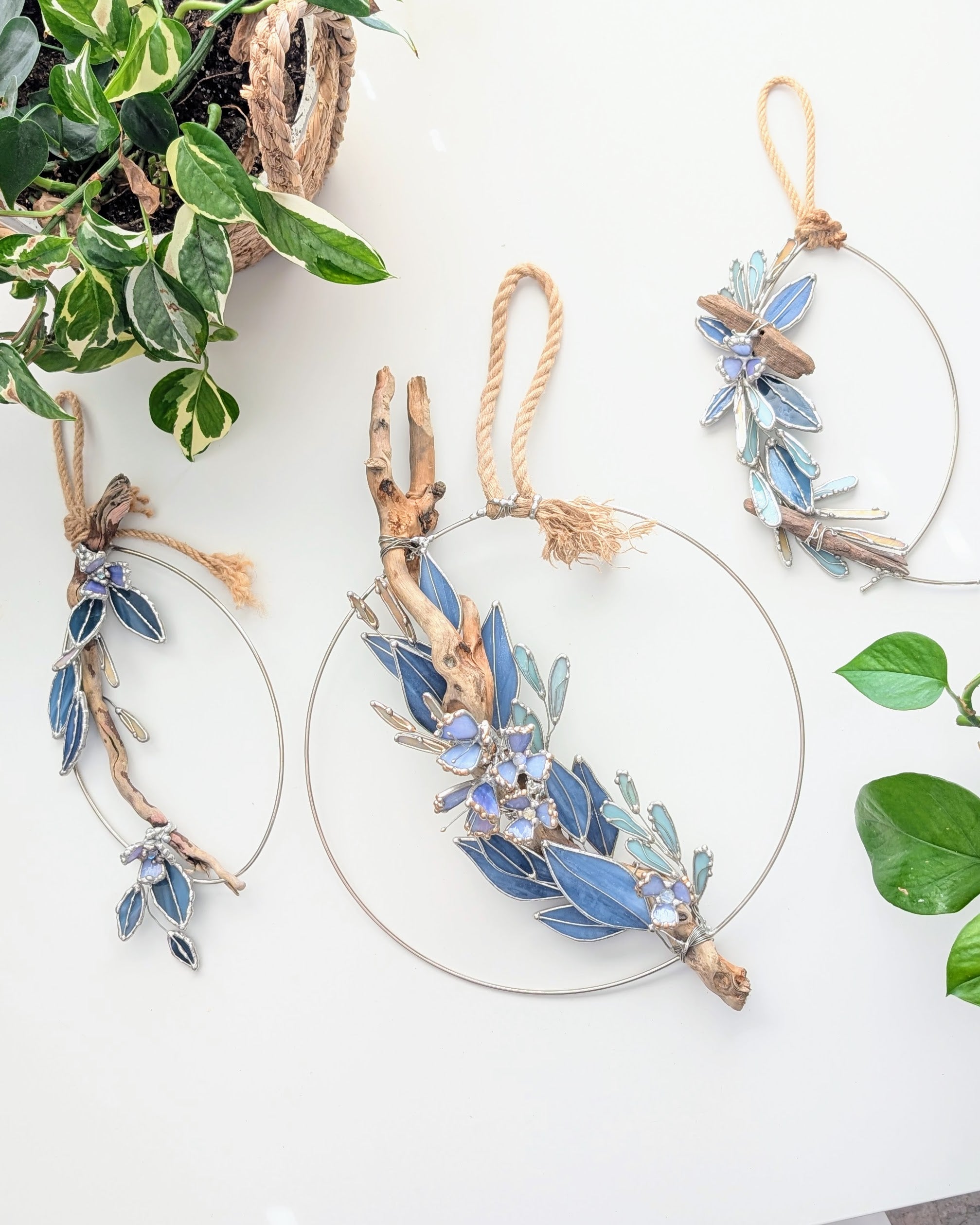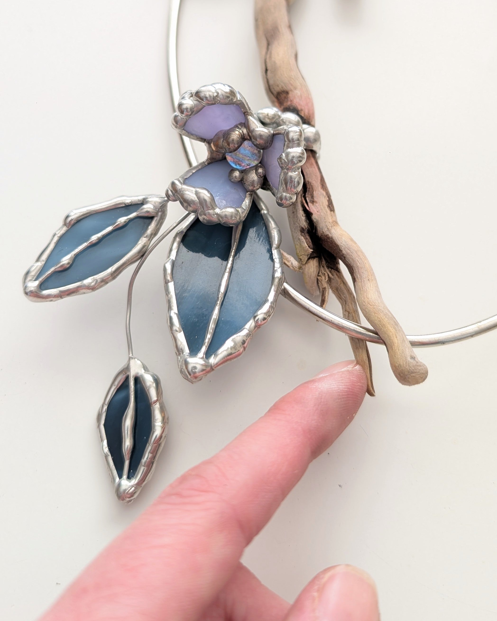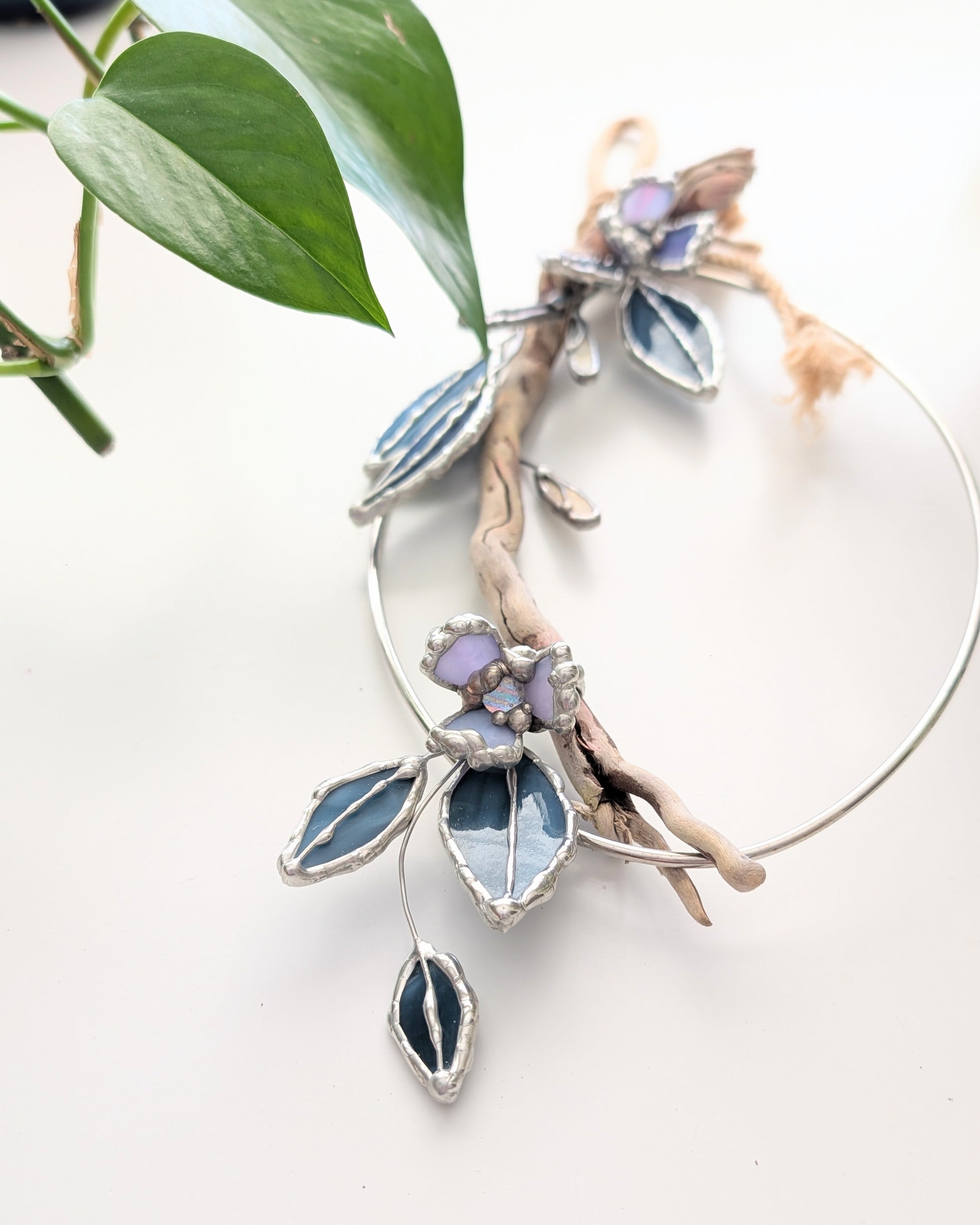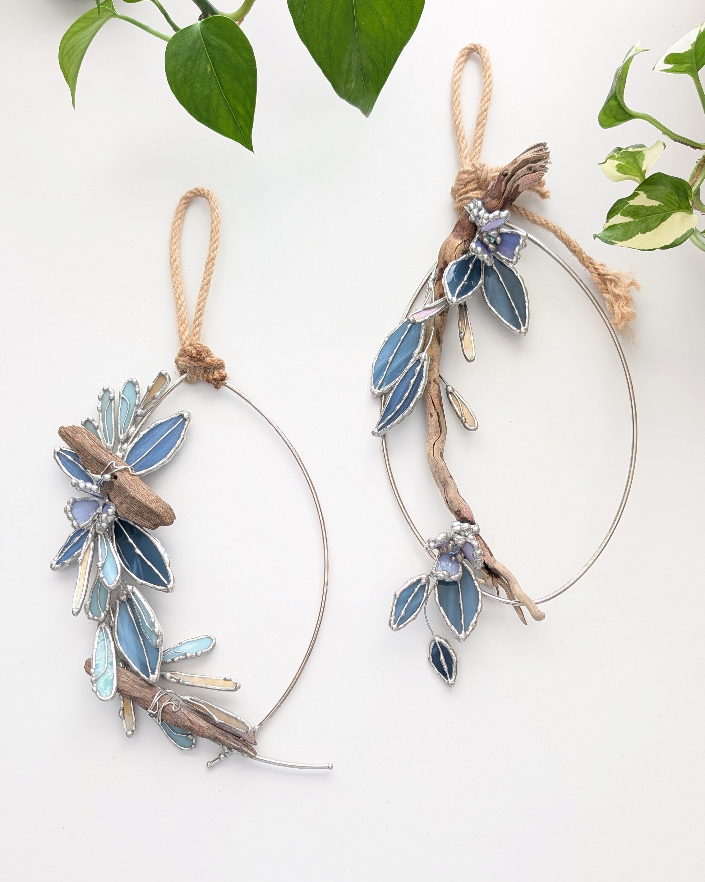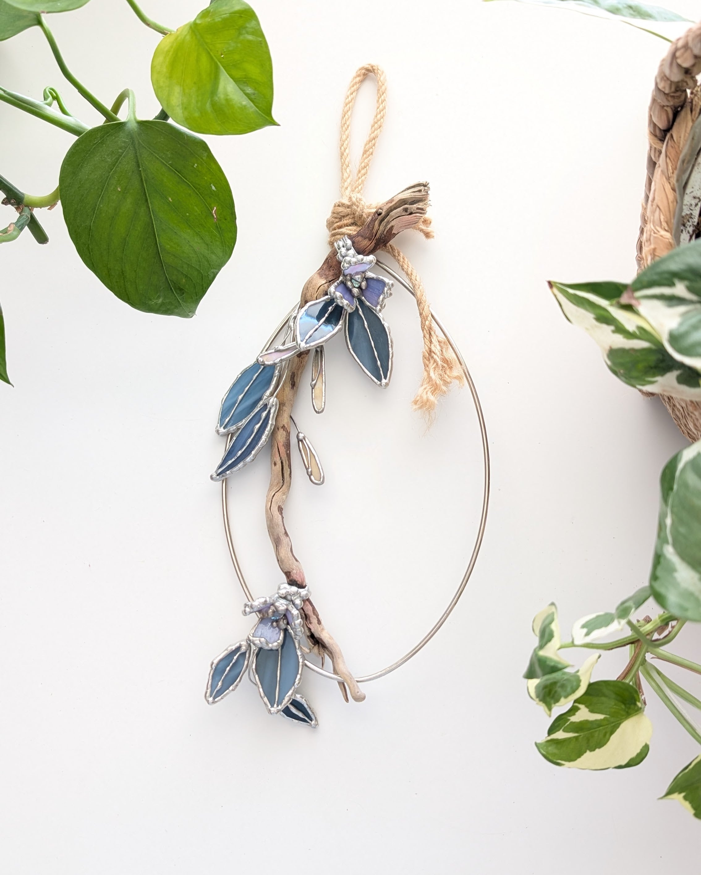 Tidal is an 11" tall stained glass/mixed media botanical halo with hand-selected driftwood, layered blue glass leaves, and soft violet floral details on an oval metal frame. The open shape keeps it feeling light and airy, while the driftwood adds warmth and texture.