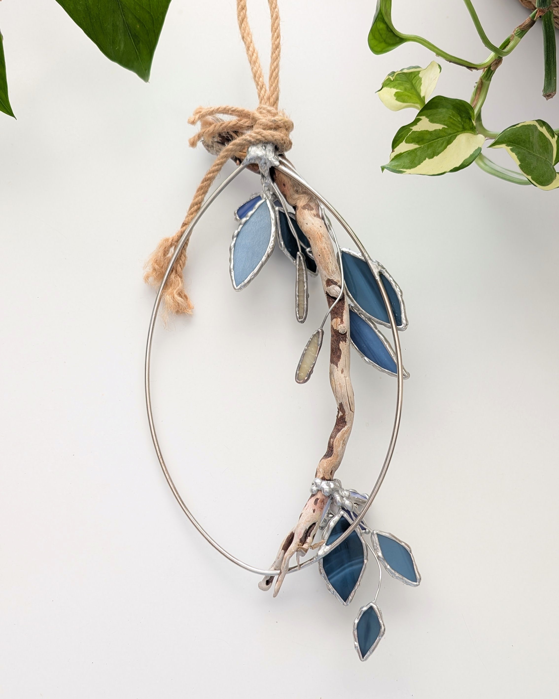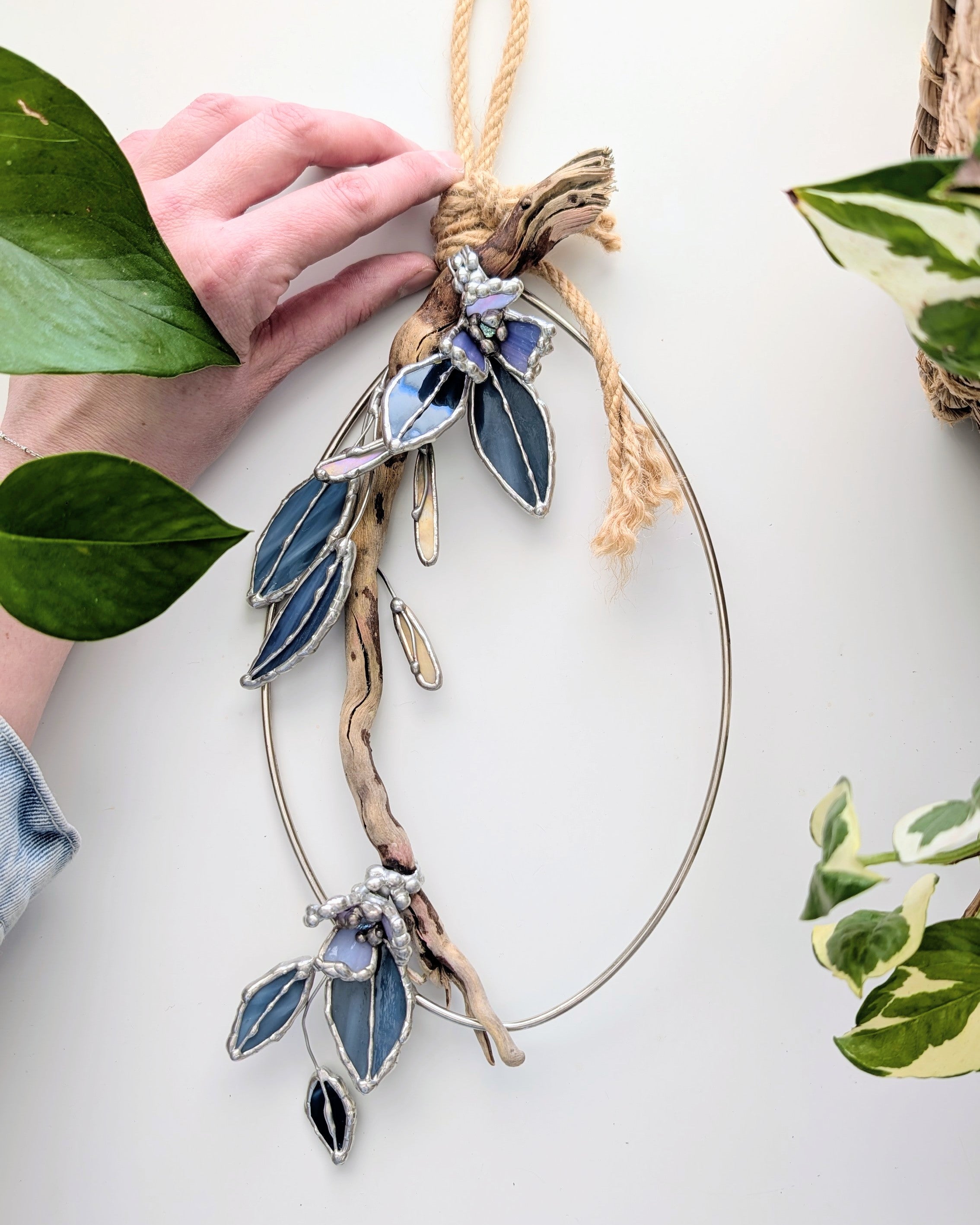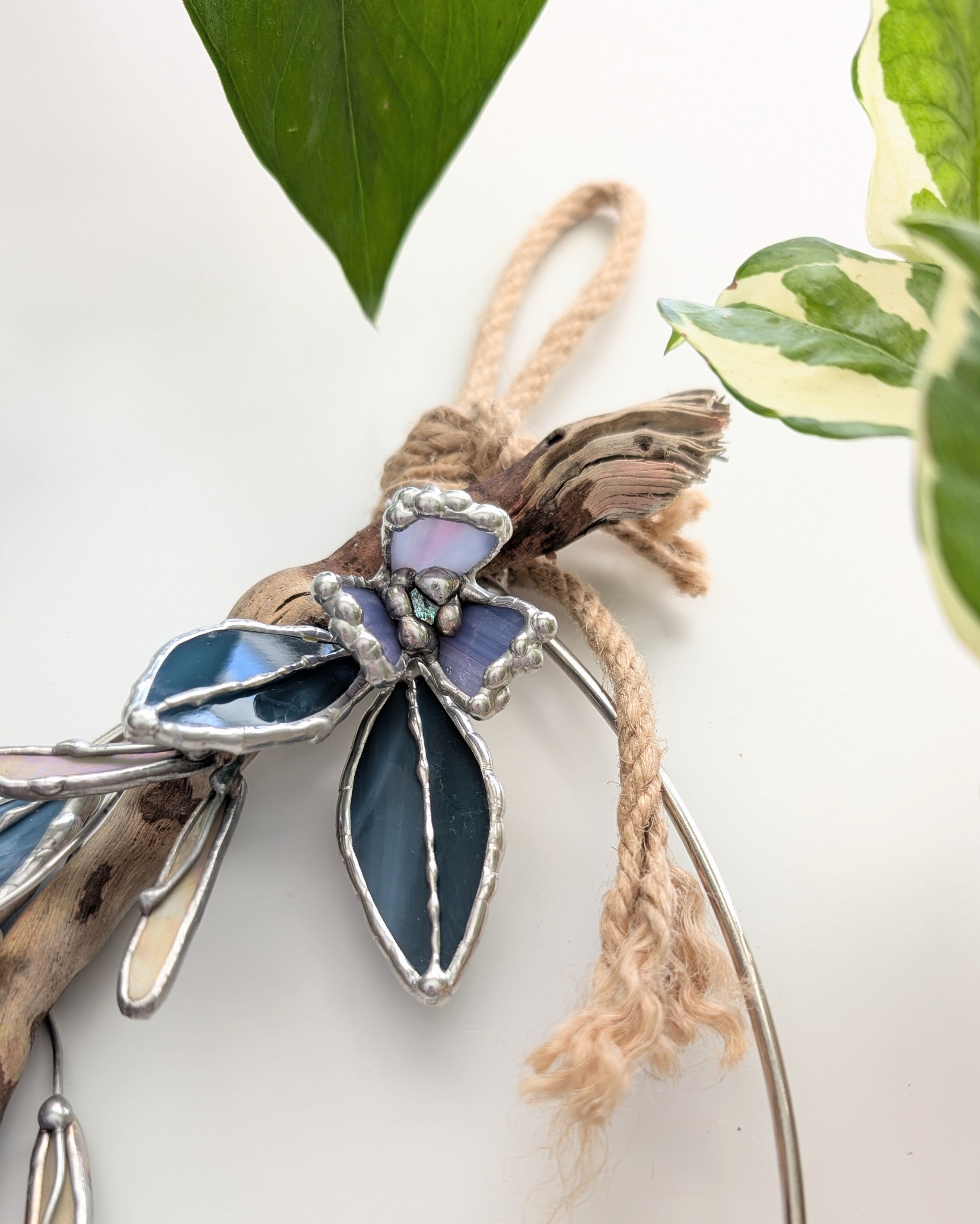 - Stained glass, kiln-formed glass gem, jute rope, driftwood, wire, metal frame